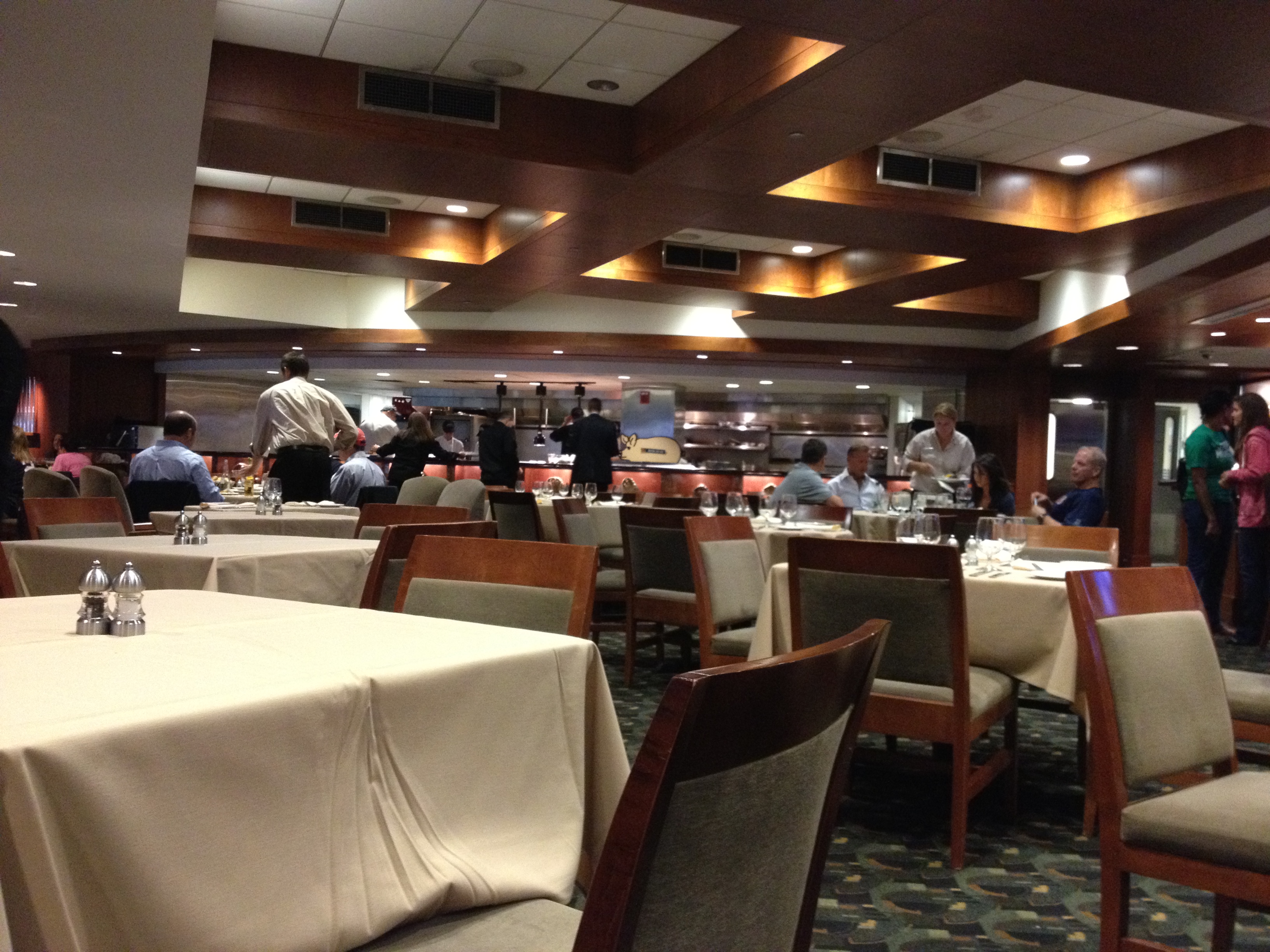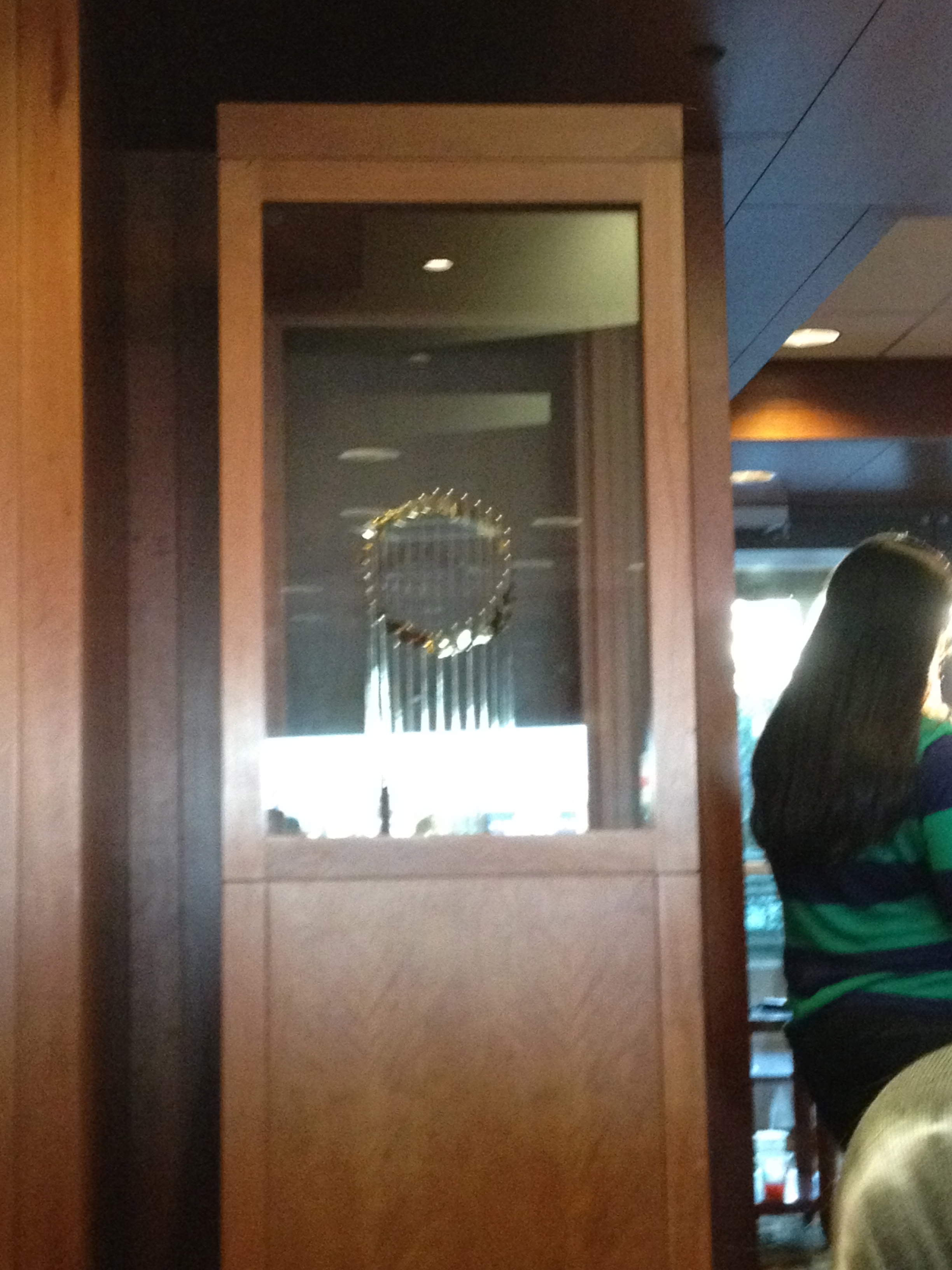 We hit the elevator to the actual EMC club. We had reservations in the restaurant there. Again, you have to have EMC club tickets to eat in the restaurant. Gives you that “private club” feeling like you are a part of something so many are not. We were promptly seated by the hostess and I had a nice view of the 2004 and 2007 world series trophies in front of me. I have to admit I was totally on the bandwagon in 04. Larry Luchino walked in with two pals while were there. Big smile on his face. Shit, I would be smiling if I owned this joint too.
