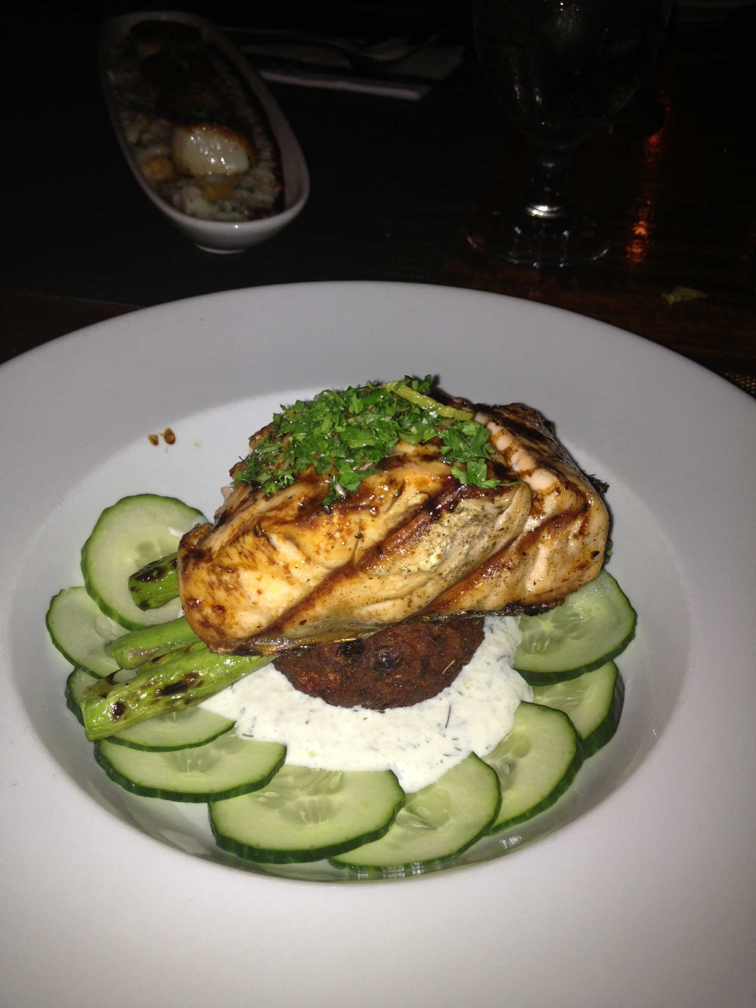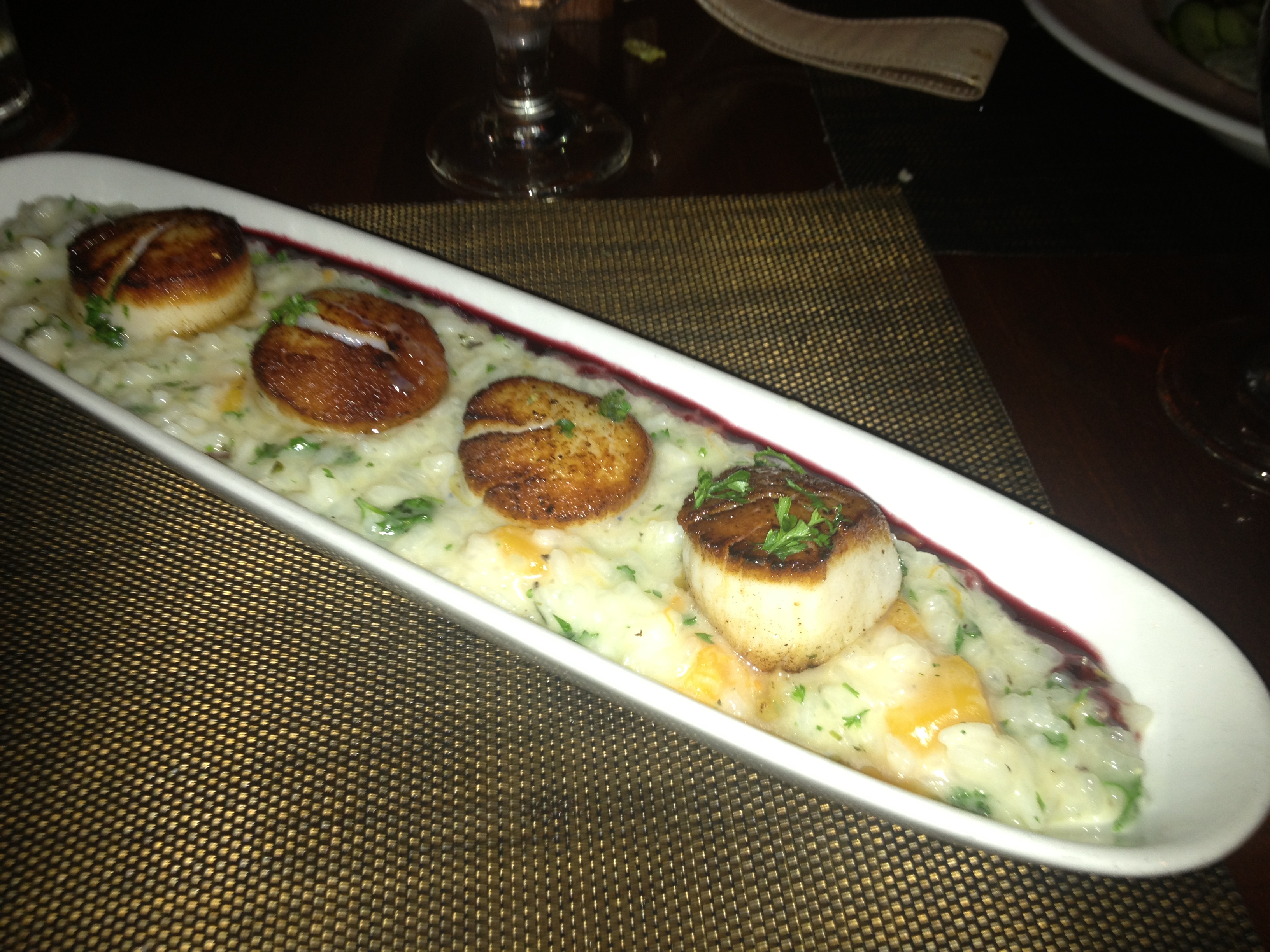 IMG_3498For the main course I got the scallops over squash risotto. My girl got the salmon. My meal was good. There were four medium sized scallops served over the risotto. The scallops were fresh and delish. It was a rather small portion but was enough with the oysters and salad. It was served on a fancy long plate which almost made it look like an appetizer. The risotto was decent but it lacked flavor and I had to douse it with salt and pepper for some flavor. One thing is kind of funny about this place is they don’t have salt and pepper shakers. You ask for salt and pepper and they come over with grinder and for the salt they will give you this little cup with salt in it and a tiny spoon. Kind of more of a pain I think than it’s worth. Salt and pepper shakers work fine for me.