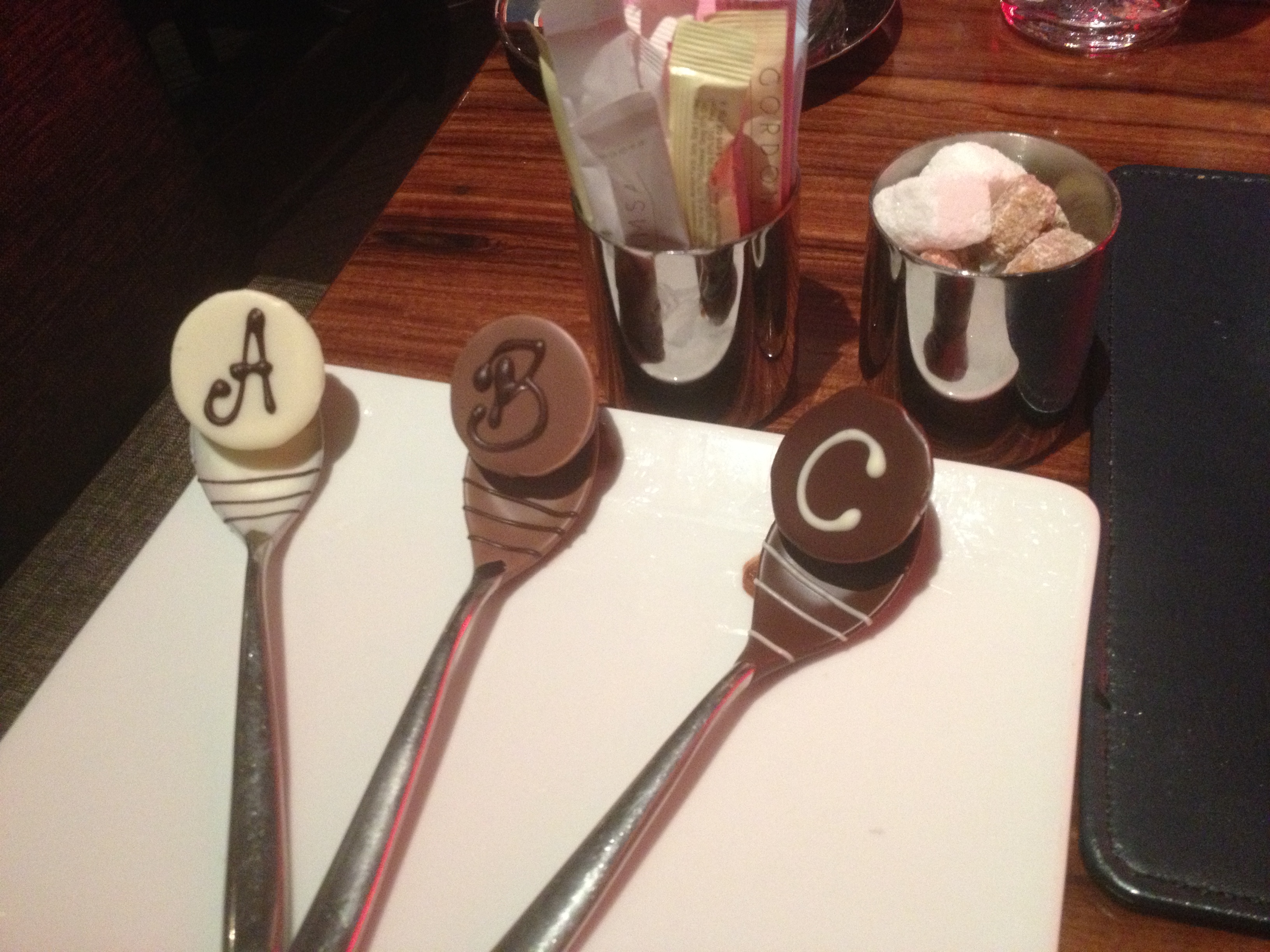 Even after the dessert I wanted to stay and enjoy the atmosphere a little longer so I ordered a cappuccino.  It came with something totally new to me.  Three spoons with chocolate on them.  One said A, one said B and one said C all written in Chocolate.  Really cool.  The A was for Amaretto, the B for Baileys and the for Chambourd.  The waiter explained you pick one and put it in your cappuccino.  The chocolate will melt and you will have a shot of liquor of your choosing in your cappuccino.  Wow, how cool.  I picked the Baileys and it was as delicious of a cappuccino as I’ve tasted.