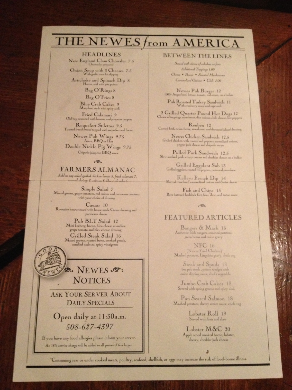 IMG_4071Another Summer on the Vineyard has come to an end.  Restaurants are closing left and right now that Columbus day has come and gone.  This is the time of year on the Vineyard when you call a restaurant and cross your fingers that someone answers the phone.   A decent spot that is opened year round in Edgartown is The Newes from America Pub.  “The Newes” as most call it is located on the bottom floor, or may as well say the basement,  of the Kelley House hotel.   The Kelley House was built in 1742 so, needless to say it’s an old building.  It’s right in the middle of  Edgartown so it’s a great hotel to stay at and gets good reviews.